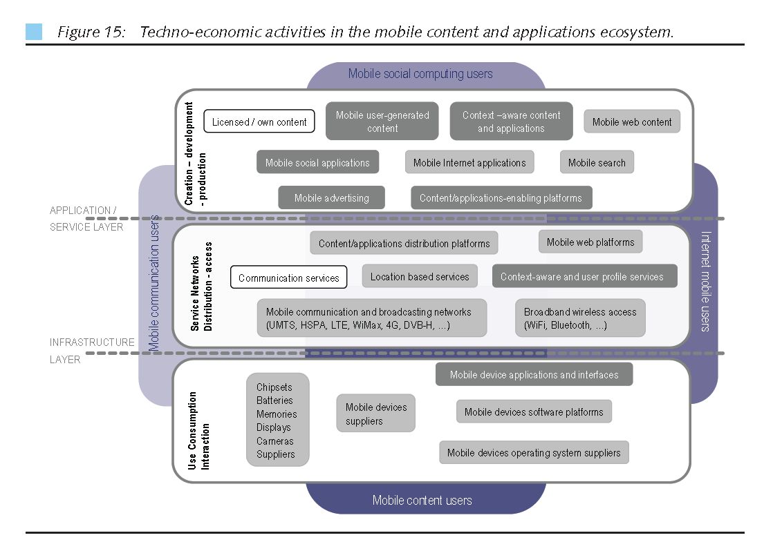 In Part II: On defining Social Computing, its Scope and Significance, you have a chapter (chapter 4) which is completely dedicated to mobile social computing and which offers some great tables and analysis. You might want to click on the image to enlarge the picture, it gives an overview of the techno-economic activities in the mobile content and applications ecosystem. So just taken out two quotes from the report: