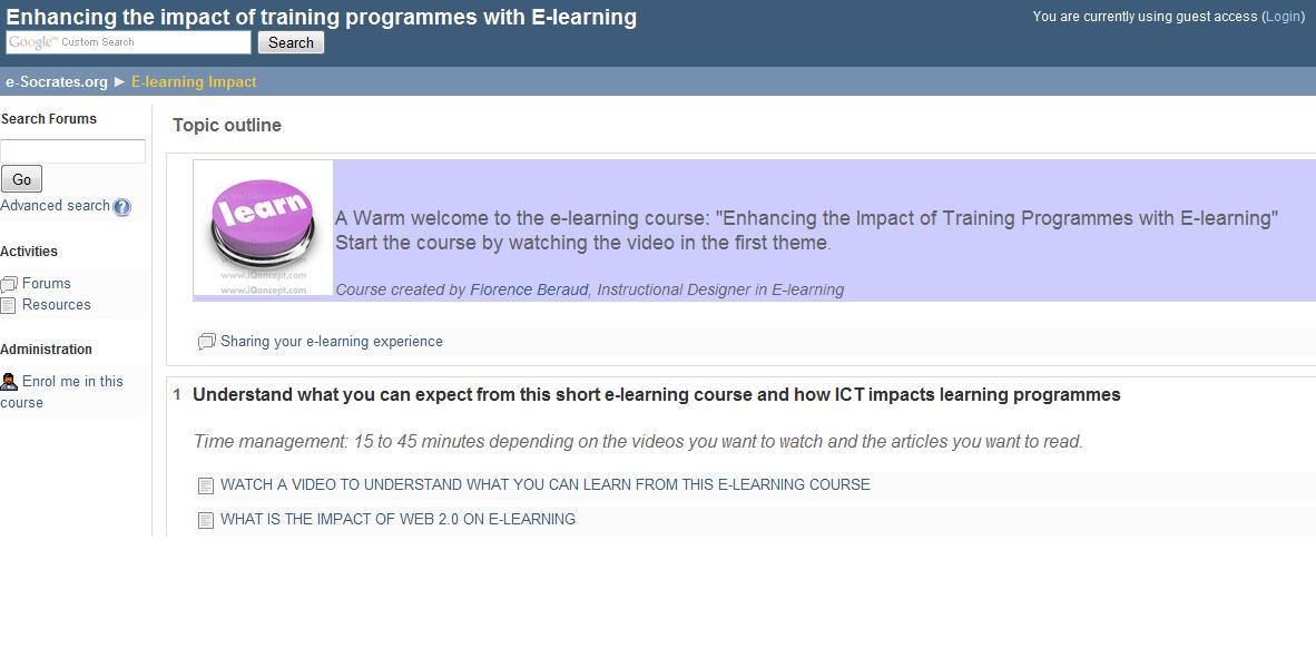 In the past I had the pleasure and honor to work with Tom Wambeke at ITC in Turin for online sessions on the topic of mobile learning. During these sessions I also met Florence Beraud, who is now working as an independant consultant in eLearning. She just set up a wonderful platform with an eLearning course and featuring eLearning examples from all around the world. The reason behind this platform is to show people what is possible with eLearning as an educational method.